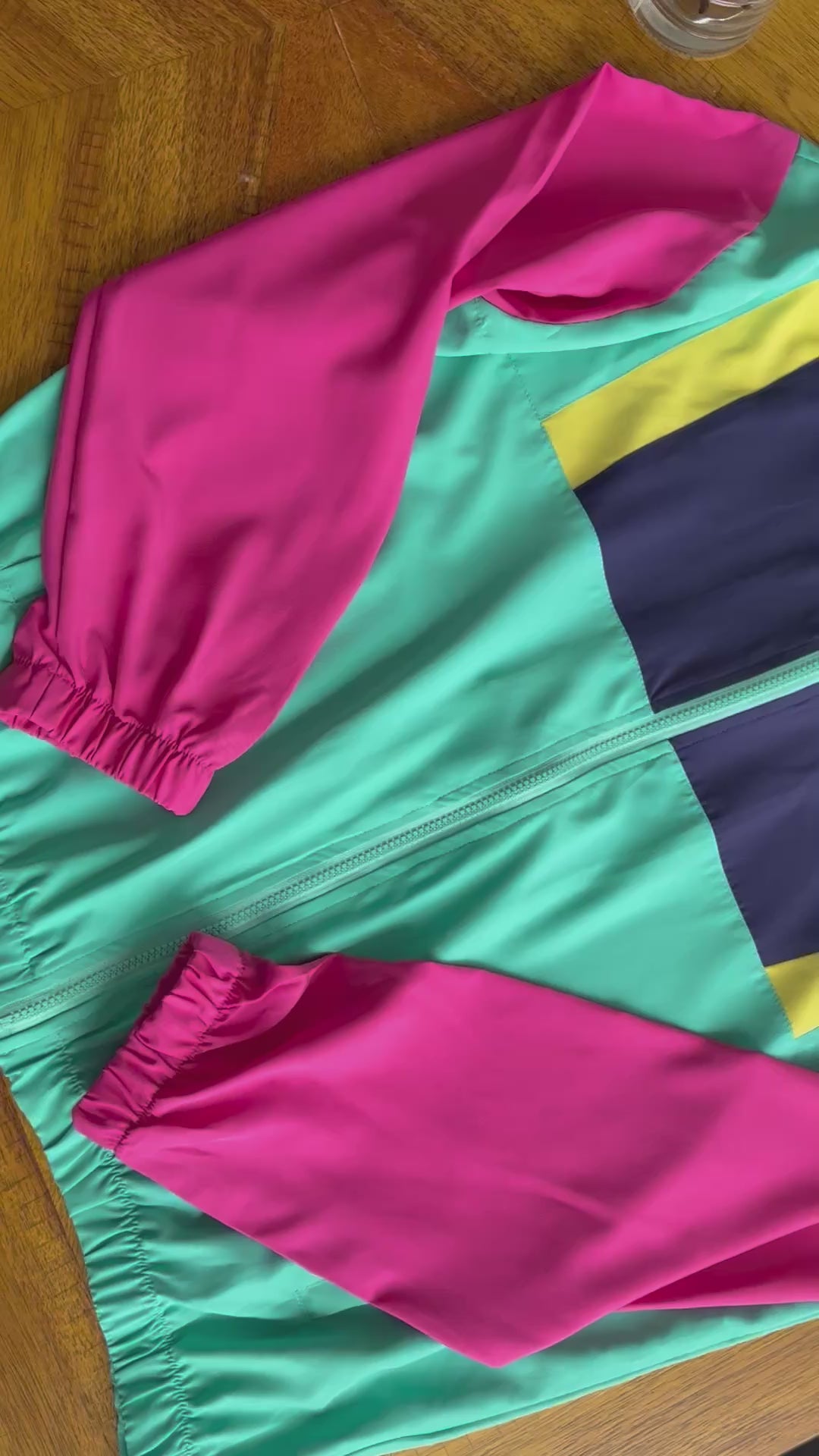 - Estampado: Bloques de colores contrastantes (turquesa, fucsia, morado y amarillo)
